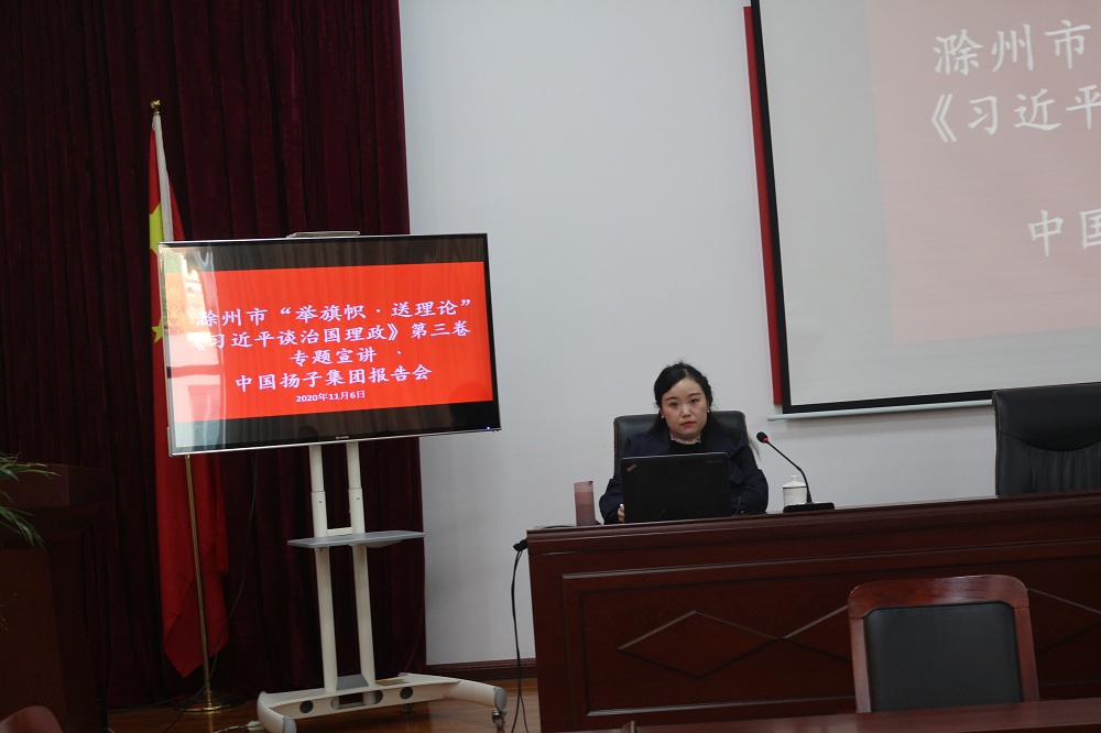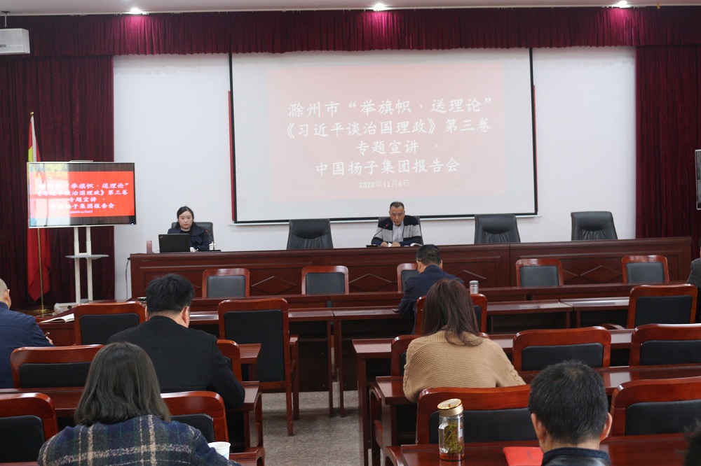 為學懂弄通做實習近平新時代中國特色社會主義思想,深入學習宣傳貫徹習近平總書記考察安徽重要講話精神和黨的十九屆五中全會精神,推動黨的最新理論成果在國有企業落地生根,開花結果, 11月6日下午,滁州市“舉旗幟·送理論”《習近平談治國理政》第三卷專題宣講中國揚子集團報告會在揚子集團舉辦,揚子集團黨委班子成員、黨員干部和全體職工參加活動。